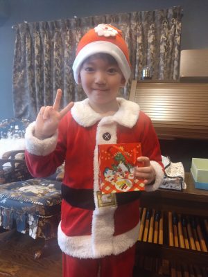 今日は、サンタクロースの服を着て、レッスンに来てくれました。